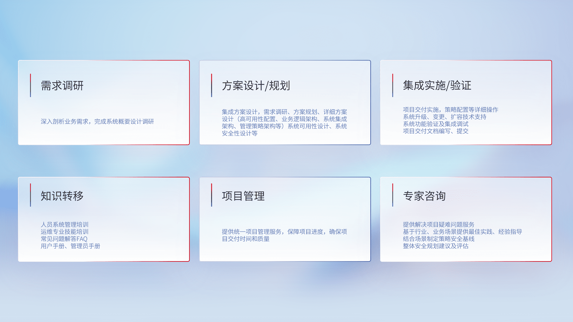 针对客户行业特性,,,,将宏观的安全战略和需求,,,,通过专业的交付服务,,,实现项目落地,,,为客户提供标准规范的集成交付服务。。