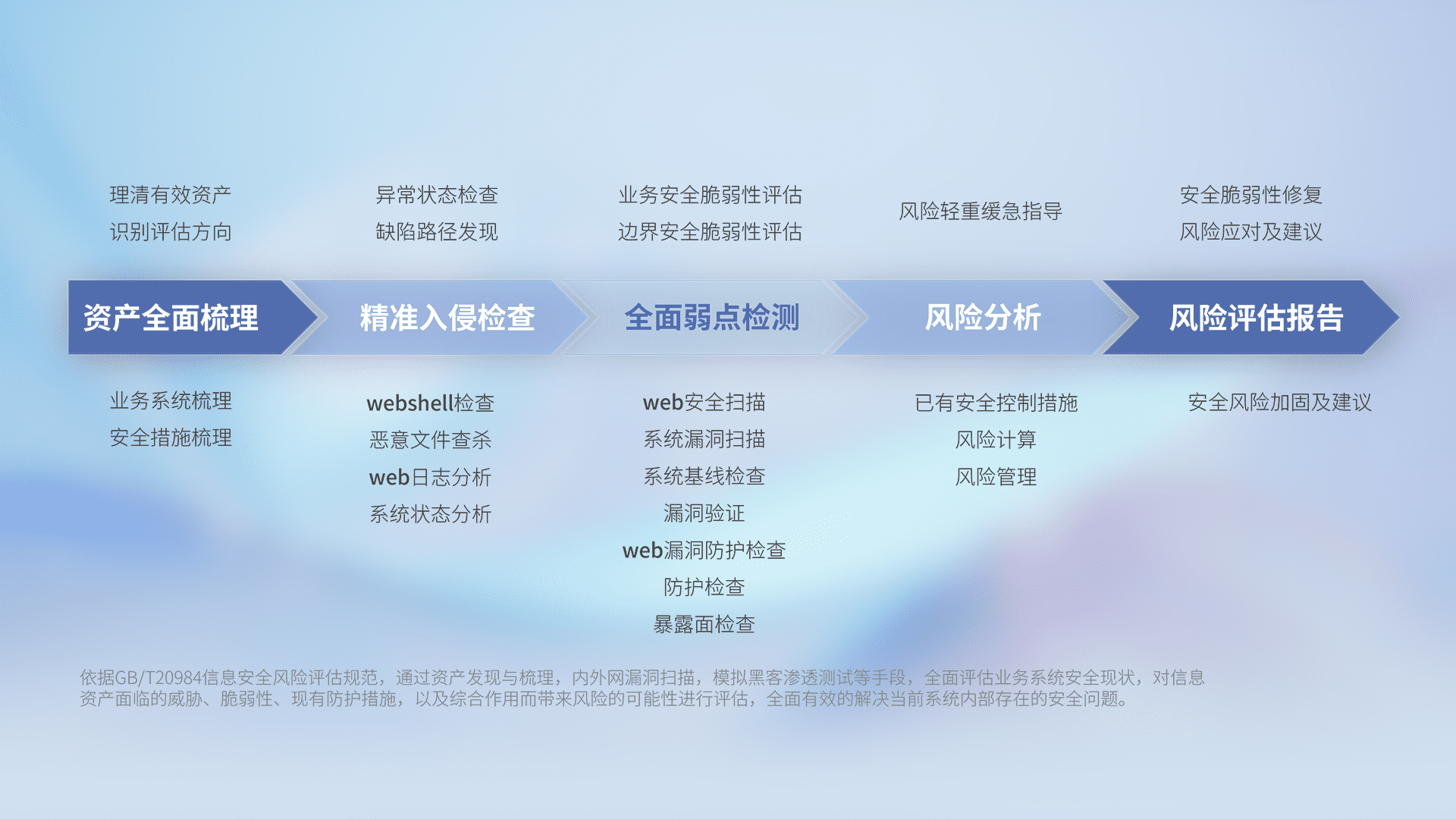 针对客户行业特性,,,,以专业的安全服务+多厂商联合解决方案提供专属的一站式安全管理服务,,,帮助客户全面感知网络空间威胁,,基于识别、、检测、、、、分析、、、、防护、、、监测、、、响应的服务理论模型,,,,从方案咨询、、集成交付、、评估验证、、、、优化加固、、、运维运营,,,,致力于为客户提供完整的闭环管理式安全服务。。以实战经验为客户打造高抵御风险的安全体系,,,帮助客户发现威胁、、、对抗威胁、、处置威胁,,不断积累安全对抗能力,,,,持续保障数字化安全。。。。