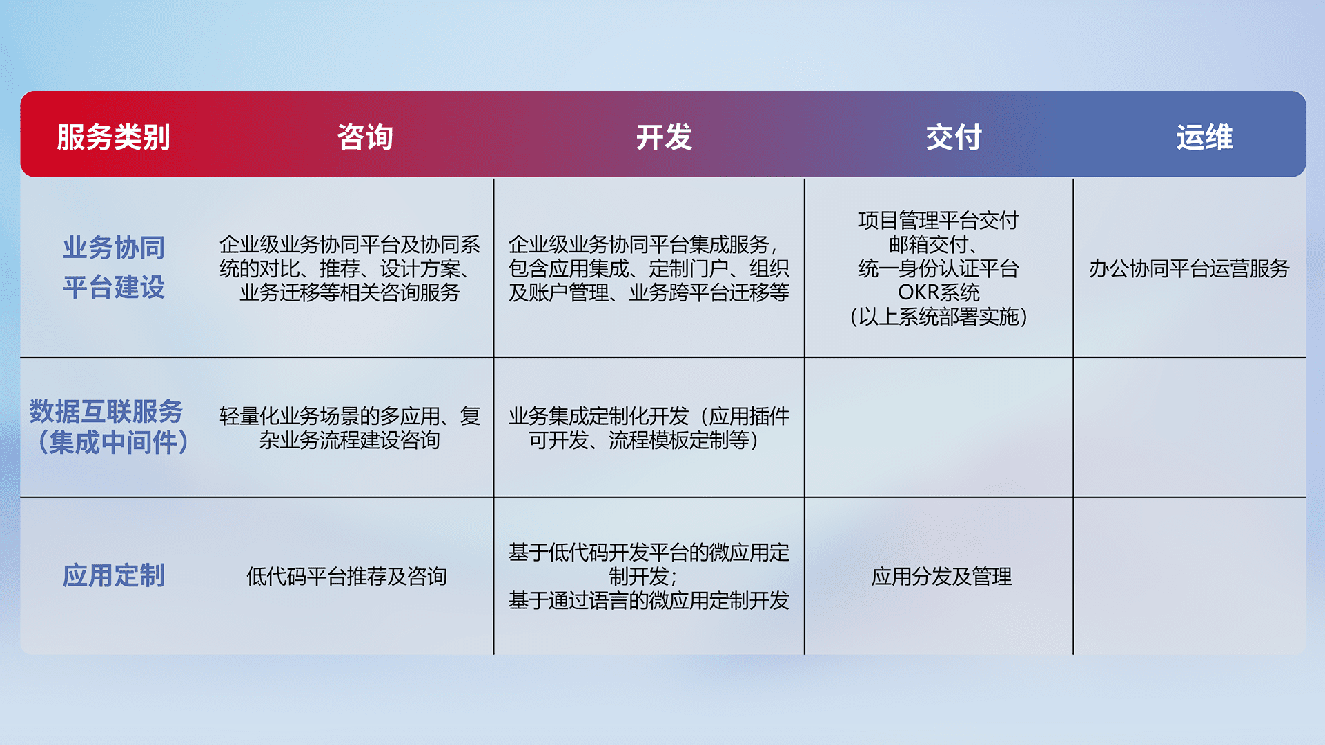 针对钉钉、、、企微、、、IDaas等平台级产品提供产品的规划、、方案、、、、交付、、、定制化开发等服务,,,实现如统一协同办公、、智能客户服务、、、、混合会议管理、、、智能数据查询、、等业务场景,,,实现数字化转型。。。。